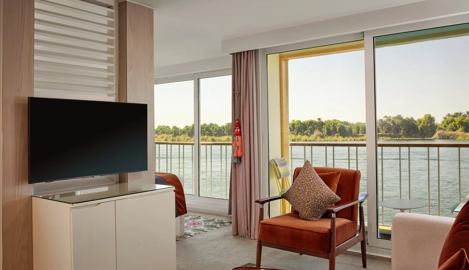 Een French balcony aan boord van een rivierschip is geen terras maar wel een schuifdeur die open kan tot aan de reling. Dit type “balkon” biedt het voordeel van frisse lucht en het gevoel van een terras, maar dan zonder de buitenruimte ervan.