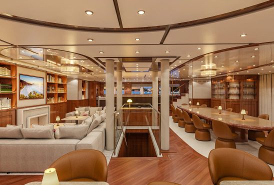 Aan boord ontdek je een wereld van design: strakke stukken van Minotti en Poltrona Frau contrasteren met antieke kaarten en prenten, een harmonieuze mix van traditie en moderniteit die de schoonheid van natuur en tijdloos design viert.