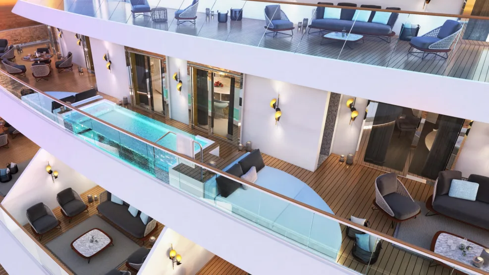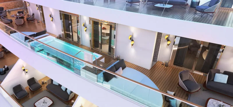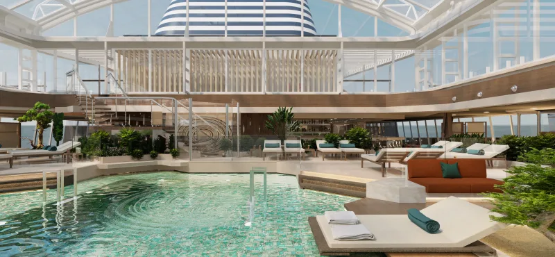 Geïnspireerd door de zee, beleef je aan boord een zalige “Ocean State of Mind” vanop de royale buitendekken. Maar opvallend is ook dat er 3 buitenzwembaden zijn (waarvan 1 adults-only) met privécabanas en meerdere binnen- en buitenbubbelbaden. Er is ook een binnenzwembad waarvan het glazen dak geopend kan worden.