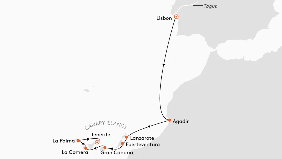 De Portugese metropool Lissabon, het magische Marrakech en de vulkanische landschappen van de Canarische Eilanden – verheug u op idyllische indrukken tijdens een route door de Atlantische Oceaan.