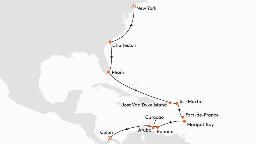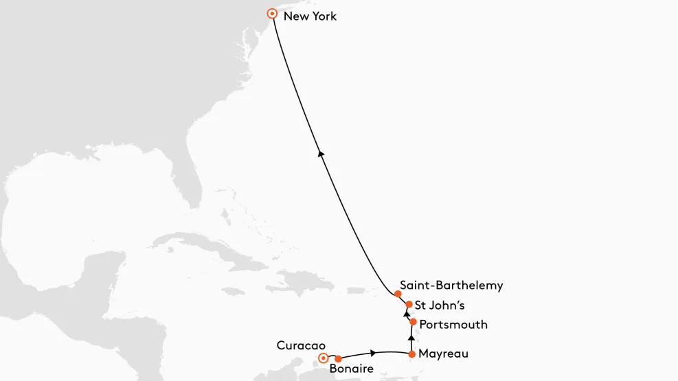 Roze flamingo’s op Bonaire, sneeuwwitte stranden op Mayreau en bulderende watervallen op Dominica verenigen deze fantastische cruise met een spectaculaire finale in New York.