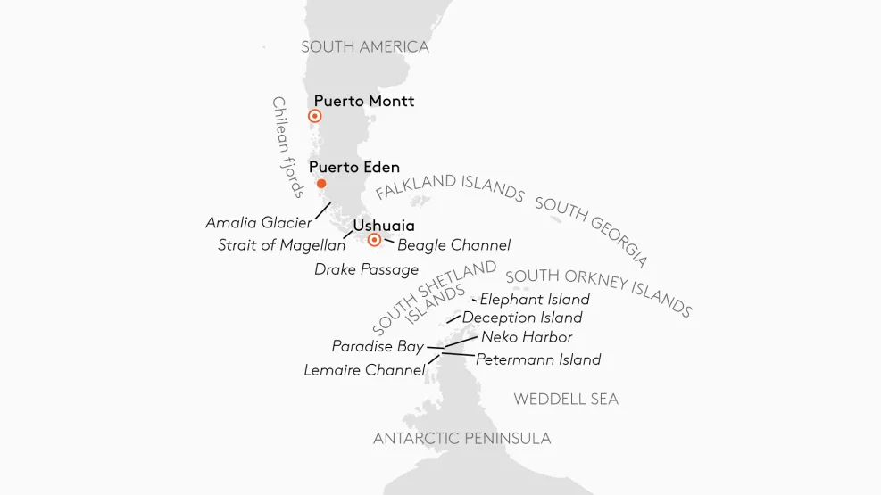 - Nieuwe route, twee afvaarten. Of het nu tijdens Kerstmis en Nieuwjaar is of eind januari – deze expeditie combineert de wonderen van rots en ijs. Een combinatie van cruisen in de ruige fjorden van Chili en avonturen in de mooiste regio’s van Antarctica.