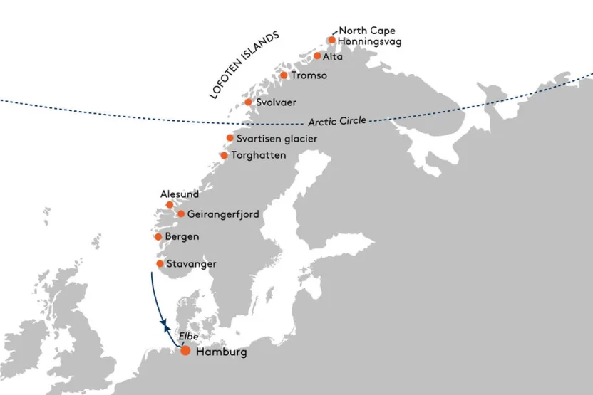 Welkom in de hanzestad Hamburg, één van de leukste en meest verrassende steden in Duitsland, en tevens het start- en eindpunt van deze bijzondere reis. Hoe noordelijker de koers, hoe groter de kans op het noorderlicht. Alta is de locatie voor een ervaring met de hondensleden*, een ontspannende winterwandeling* of een bezoek aan de Sami*.