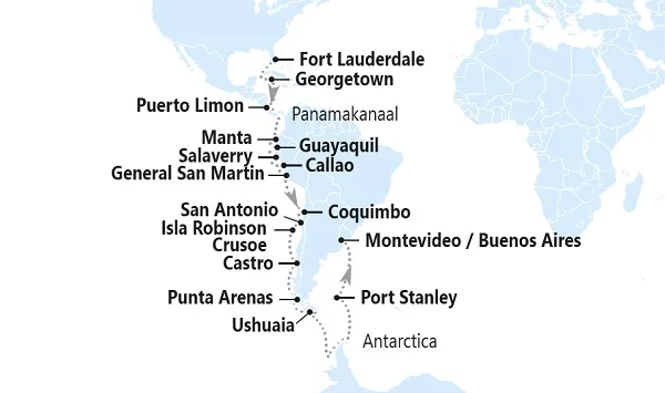 Fort Lauderdale – Georgetown – Puerto Limon/San Jose – Panamakanaal – Manta – Guayaquil/Quito – Salaverry/Trujillo – Callao/Lima – General San Martin/Pisco – Coquimbo/La Serena – San Antonio/Santiago – Isla Robinson Crusoe – Castro, Isla Chiloe – Chileense fjorden – Sarmientokanaal – Straat van Magellaan – Punta Arenas – Cockburnkanaal – Beaglekanaal – Glacier Alley, cruising – Ushuaia – Kaap Hoorn & Drake Passage – Antarctica – Port Stanley/Falkland Islands – Montevideo – Buenos Aires