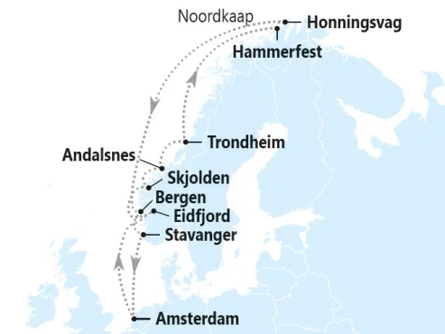 Amsterdam – Eidfjord – Hardangerfjord cruising – Skjolden – Sognefjord cruising – Andalsnes – Trondheim – Trondheimsfjord cruising – Hammerfest – Honningsvag – Noordkaap cruising – Bergen – Stavanger –Amsterdam