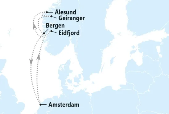Amsterdam – Eidfjord – Hardangerfjord cruising – Ålesund – Geiranger – Geirangerfjord cruising – Bergen – Amsterdam