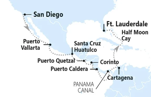 San Diego – Puerto Vallarta – Huatulco – Puerto Quetzal – Korinthe –Puntarenas/Puerto Caldera – Panamakanaal – Cartagena – Half Moon Cay – Fort Lauderdale