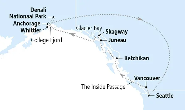 Seattle – Vancouver – The Inside Passage, cruising – Ketchikan – Juneau – Skagway – Glacier Bay – College Fjord – Whittier – Denali Nationaal Park, 2 overnachtingen – Anchorage – Seattle