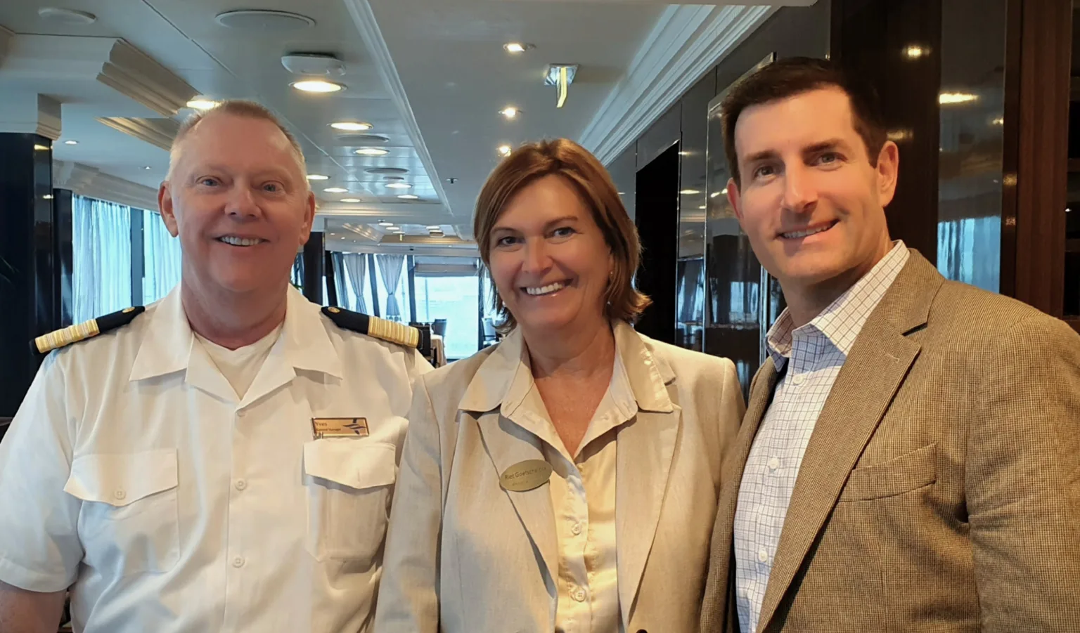 Aan boord van Insignia, Oceania Cruises, foto van links naar rechts: Yves Segers (General Manager – Sirena), Riet Goetschalckx (Sales Director CEMEA, Oceania Cruises), Jason Worth (Vice President, International Sales, Oceania Cruises)