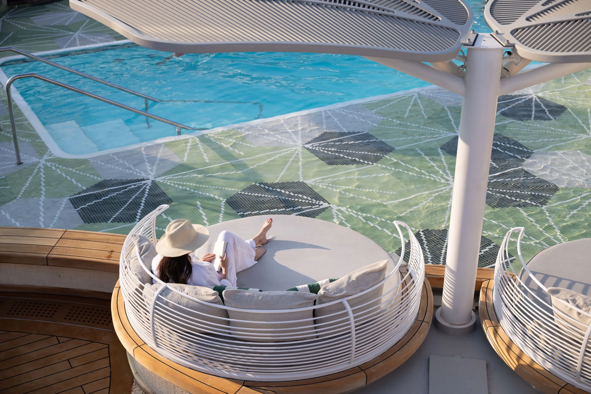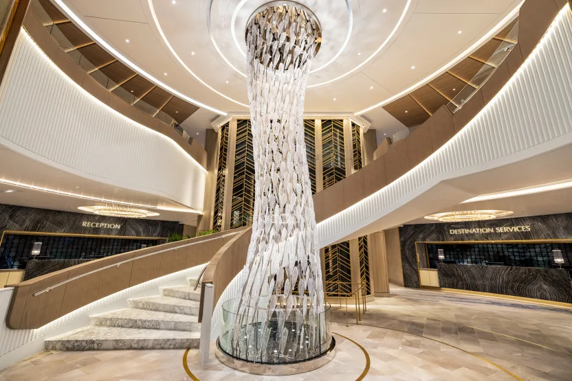 Oceania flirt met luxe en doet dat met veel emoties maar ook met veel ingetogen inzicht. Doorheen het schip is een continuïteit van elegantie verzekerd, wat ook opvalt in de inrichting van enkele gastronomische locaties. Maar het prachtstuk blijft natuurlijk het atrium met de sculpturale trap die omhoog slingert naast de indrukwekkende Lasvit-kroonluchter.”