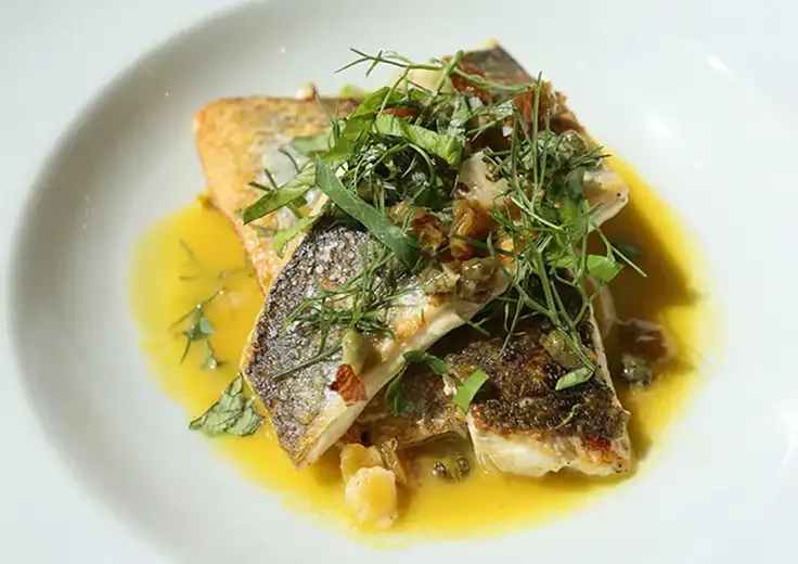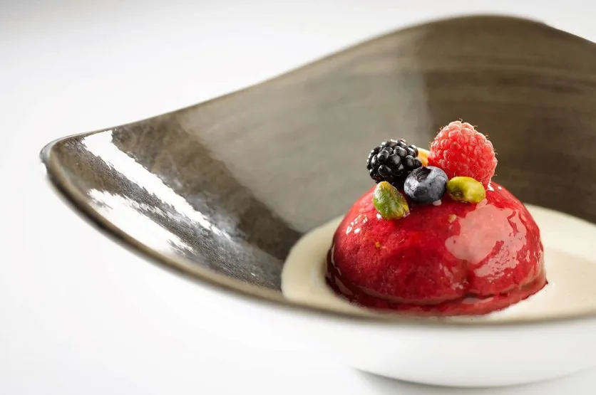Meesterlijk bereide gerechten, gepresenteerd op elegant, op maat ontworpen Versace-porselein, illustreren de essentie van Toscane en vieren de culinaire passie van Italië. Misschien begint de avond met de carpaccio van octopus met champagnevinaigrette of de timbale van artisjok en parmezaanse kaas met zwarte truffelsaus, gevolgd door klassieke gerechten zoals de handgerolde gnocchi met pesto, een rijke risotto met kreeftmedaillons en sjalotten, of een pan- aangebraden zeebaarsfilet afgewerkt met Sorrento-citroen, chardonnay en kappertjes.