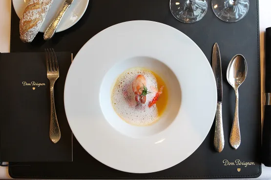 Het Dom Pérignon degustatiemenu staat garant voor een uitbundige, smaakvolle verwennerij van zes gangen, telkens gecombineerd met een speciale Dom Pérignon vintage. Volgende vintages zullen rijkelijk schuimen: de Dom Pérignon Vintage 2006 en 2009 en de Rosé Vintage 2004.