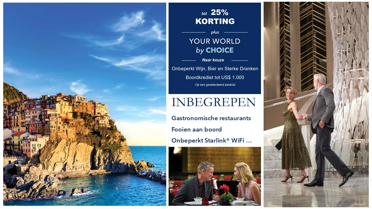 Algemene voorwaarden, beperkingen en capaciteitscontroles zijn van toepassing. De Your World by Choice Sale loopt af op 31 maart 2025 en is beschikbaar voor bepaalde categorieën, bepaalde afvaarten en wordt door capaciteit gecontroleerd. Promocode: YWC. De promotie kan op elk moment zonder voorafgaande kennisgeving worden ingetrokken. Bezoek OceaniaCruises.com voor de volledige Algemene Voorwaarden.