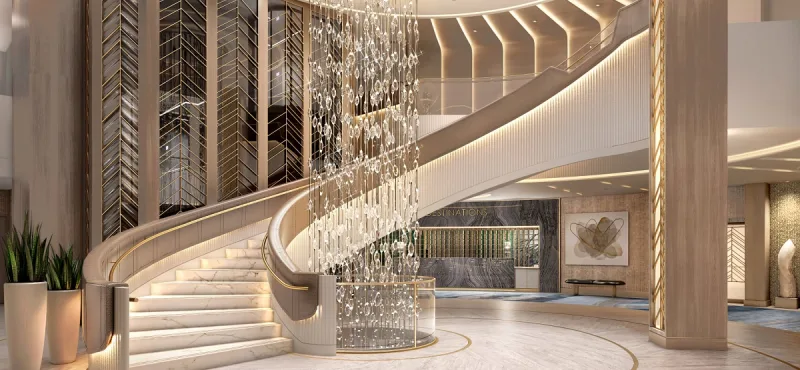 Een iconisch wonder, The Grand Staircase is waar elke cruise met Oceania Cruises begint. Strakke rondingen en elegante details, in combinatie met een glinsterende kamerhoge pilaar van kristal en licht zet de toon voor de komende reis.