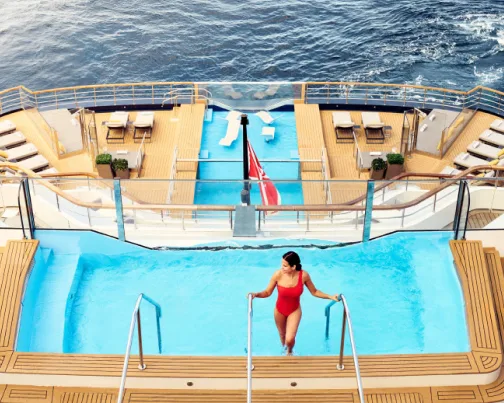 Marina, genieten van watersport. Gelegen op dek 3, biedt het ligstoelen en een ruim aanbod van watersportfaciliteiten voor een heerlijke tijd op zee. Iets hogerop bevindt zich het Marina Terrace, een verfijnde openluchtlounge waar fijne cocktails en hapjes worden geserveerd.