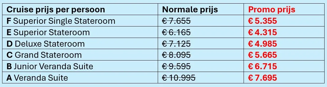 Deze promo is enkel geldig voor nieuwe boekingen en is niet cumuleerbaar met andere voordelen. Onder voorbehoud van beschikbaarheid van kajuiten.