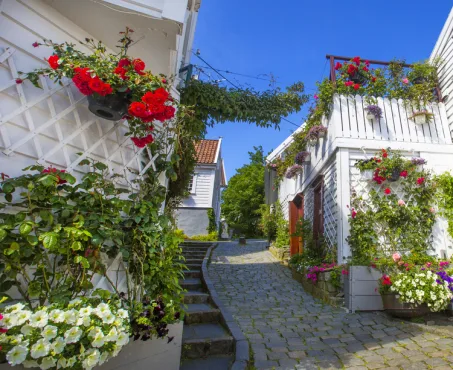 De haven van Stavanger strekt zich uit over een deel van het vasteland en verschillende eilanden op een spectaculaire locatie tussen de scheren in het zuiden en het fjordlandschap in het westen. De pittoreske oude stad, met een kathedraal die dateert uit ongeveer 1125 toen Stavanger werd gesticht, en de schitterende witte houten huizen uit de 18e en 19e eeuw worden over het hoofd gezien door de glazen en metalen gevels van internationale oliemaatschappijen. Aanvankelijk was Stavanger een belangrijk vissers- en zeevarend centrum. Vervolgens werd het ’s werelds grootste producent van ingeblikte sardines voordat de winning van zwart goud uit de Noordzee het tot een rijk oliecentrum en de vierde grootste stad van Noorwegen maakte. Stavenger heeft zichzelf in 2008 opnieuw uitgevonden als Culturele Hoofdstad van Europa. Vlakbij liggen de 612 meter hoge Månafossen-waterval, het langste zandstrand van Noorwegen, bekend als het Sola-strand, en de Lysefjord met de imposante Preikestolen-klif.