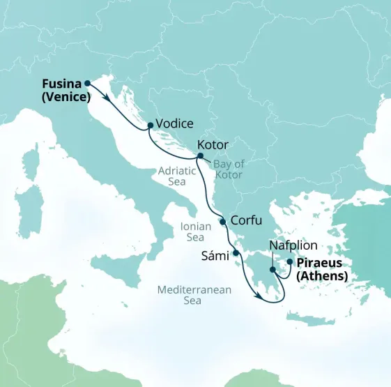 - Fusina (Venetië), Italië – Piraeus (Athene), Griekenland