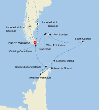 - Puerto Williams – Falkland Eilanden – Westpunt Eiland – Port Stanley – Zuid-Georgië – Antarctica & Zuidelijke Shetland Eilanden – Puerto Williams