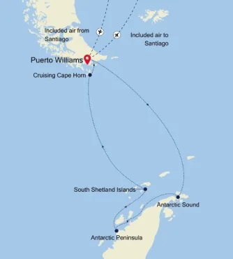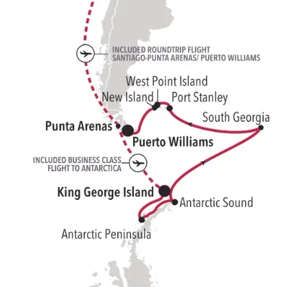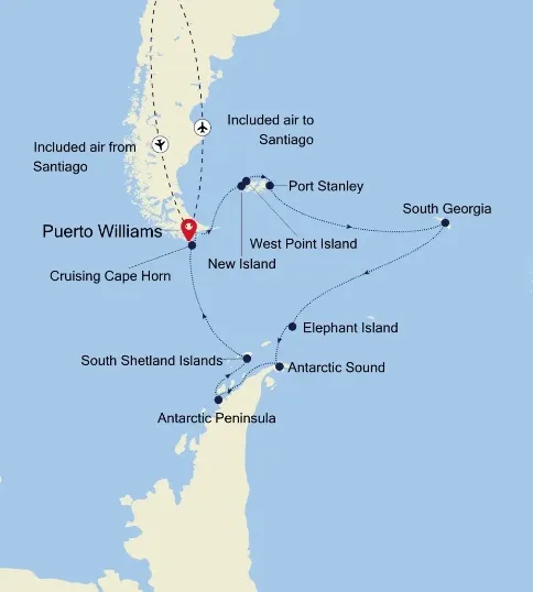 - King Georges Eiland (de enige luchthaven in de South Shetlands) – Antarctica – Drake Passage – Zuid-Georgië – Port Stanley – Westpunt Eiland – Puerto Williams