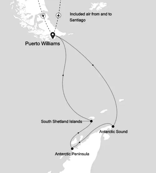 De reis vangt aan op 28/11 in Santiago de Chili. Hieraan gekoppeld is de hotelovernachting in Santiago, de binnenlandse vlucht naar Puerto Williams en transfers ter plaatse: deze diensten zijn inbegrepen in de Door-to-Door prijs.