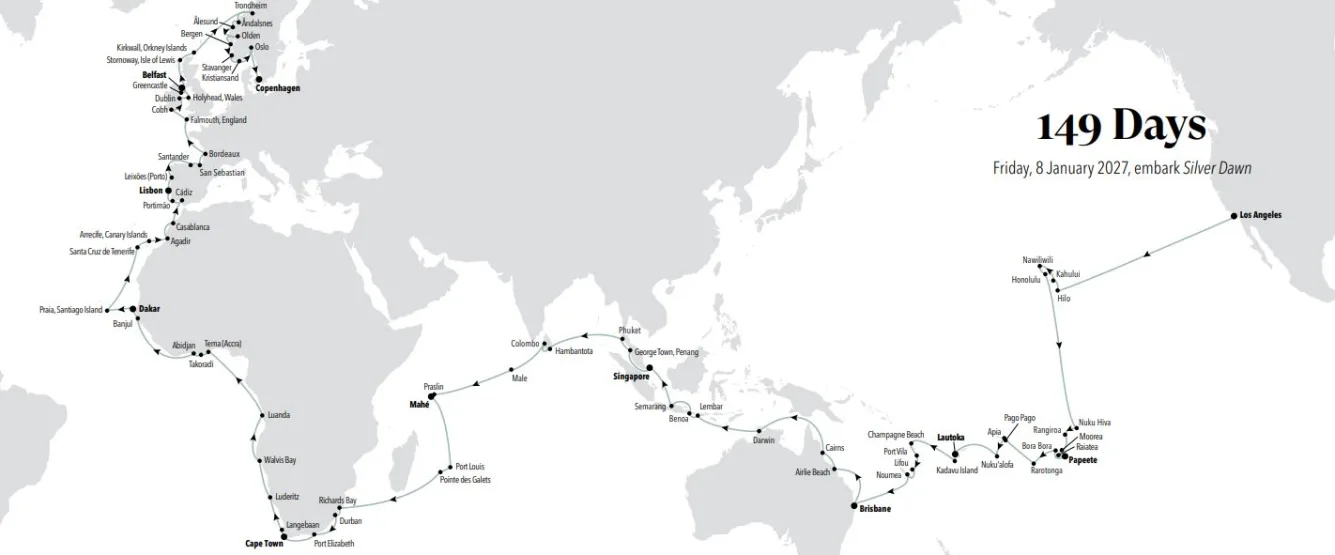 Silversea’s wereldcruise in 2027, genaamd “De Drie Oceanen”, belooft een ongeëvenaarde reiservaring te worden met een route die 80 bestemmingen aandoet over 35 landen en 5 continenten.
